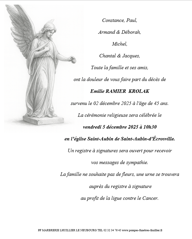 C’est avec une grande tristesse que nous vous annonçons le décès d’Emilie RAMIER survenu le mardi 02 décembre 2025 à Neuilly-sur-Seine. La cérémonie se déroulera le vendredi 05 décembre 2025 à 10h30 à l’adresse suivante : Église Saint-Aubin - 2 A Place de l'Église - 27110 Saint-Aubin-d'Écrosville.