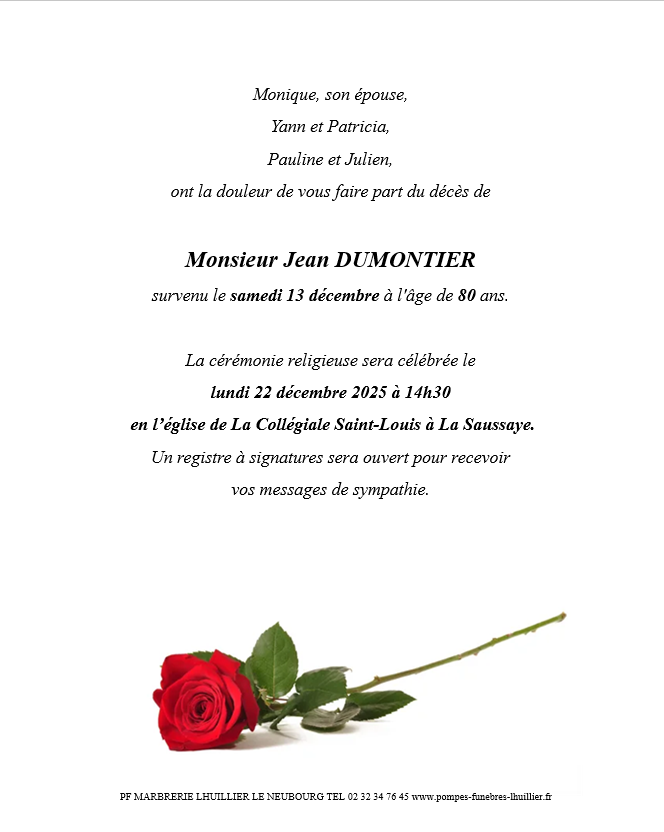 C’est avec une grande tristesse que nous vous annonçons le décès de Jean DUMONTIER survenu le samedi 13 décembre 2025 à Louviers.
