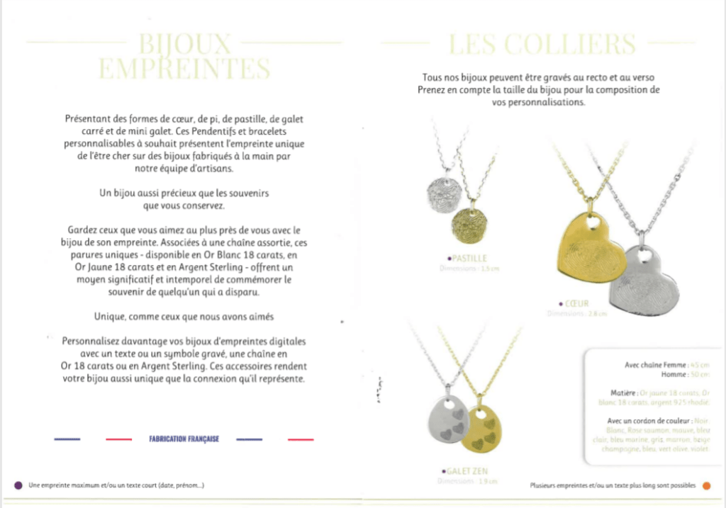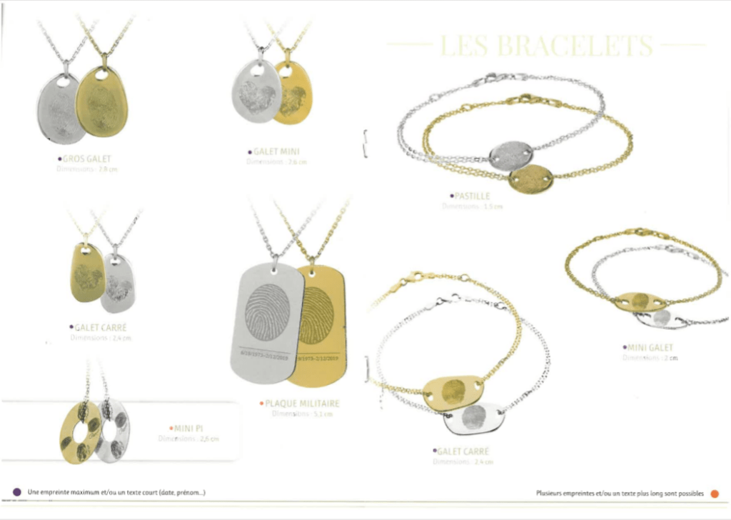 Présentant des formes de cœur, de pi, de pastille, de galet carré et de mini galet. Ces pendentifs et bracelets personnalisables à souhait présentent l’empreinte unique de l’être cher sur des bijoux fabriqués à la main par notre équipe d’artisans.