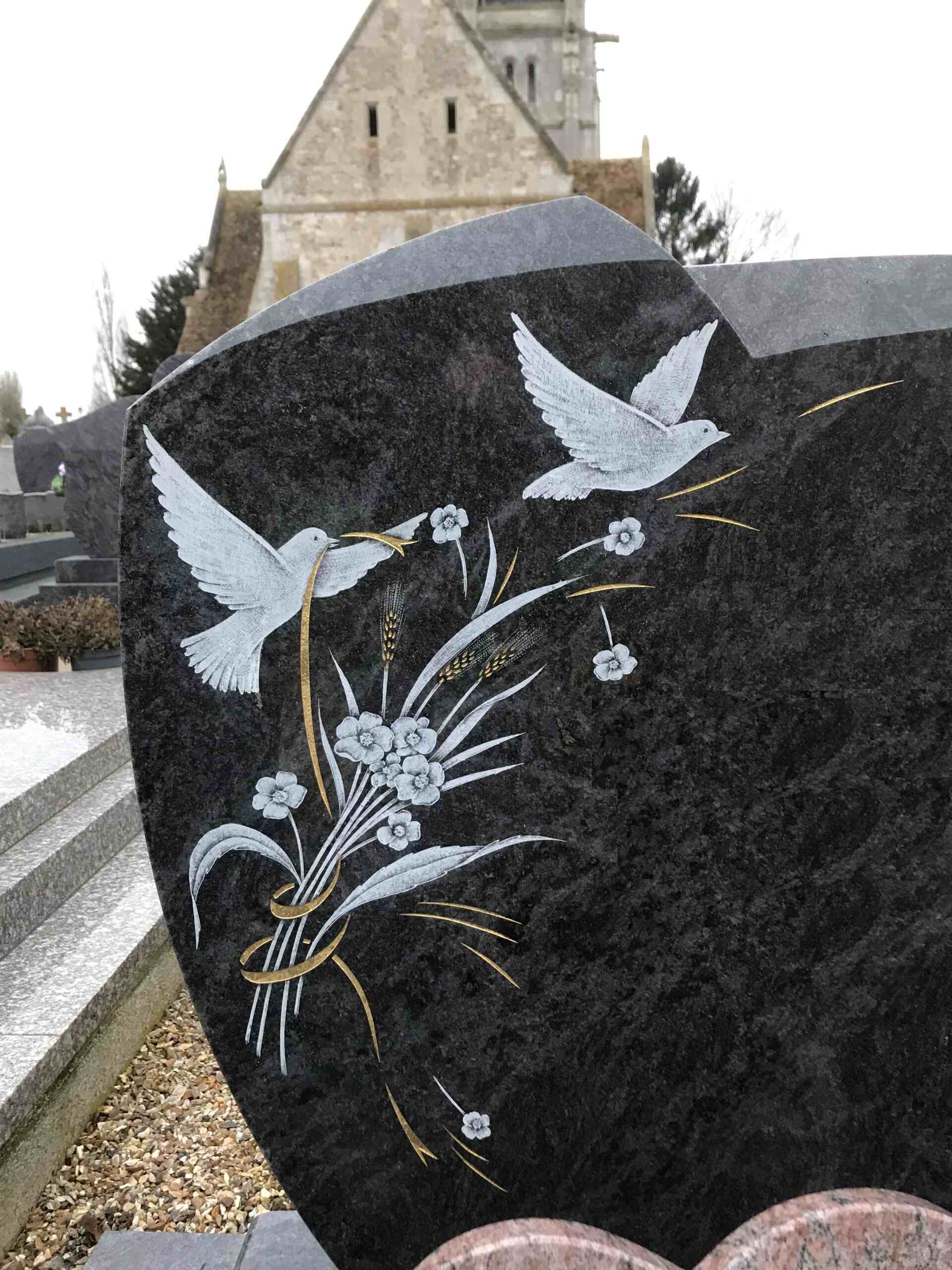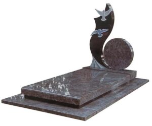 Monument funéraire en granit Labrador Bleu Haute Qualité avec stèle cœur paysage litho gravé et couple de colombe sculpté dans la masse disponible en plusieurs épaisseurs et plusieurs couleurs.