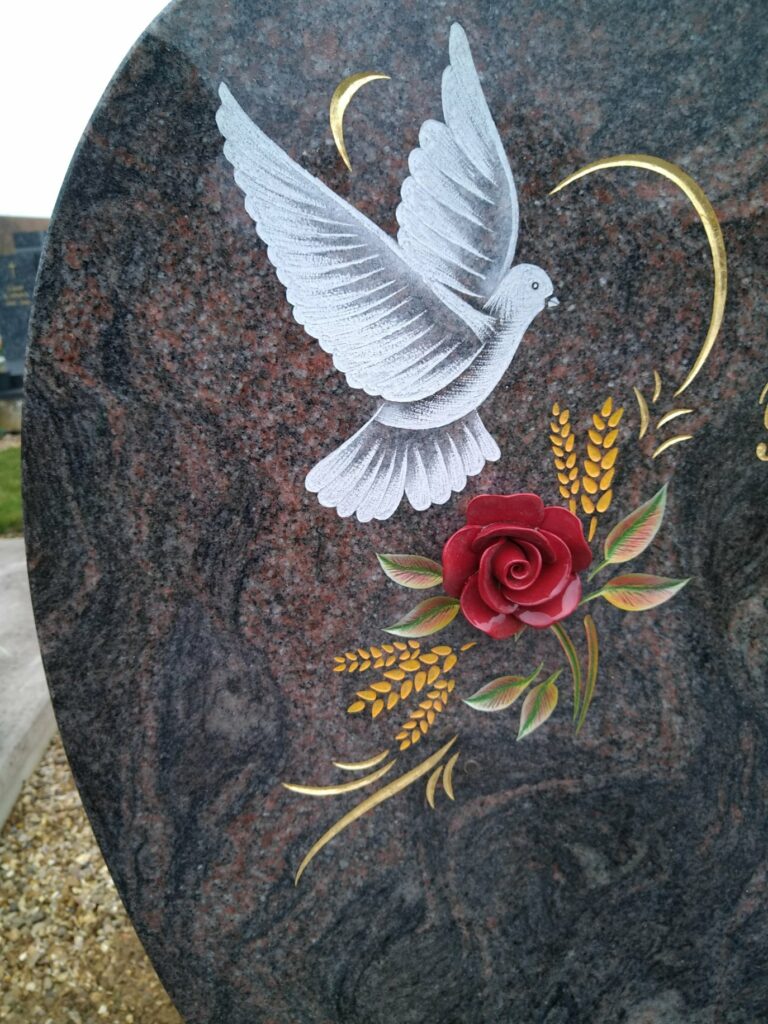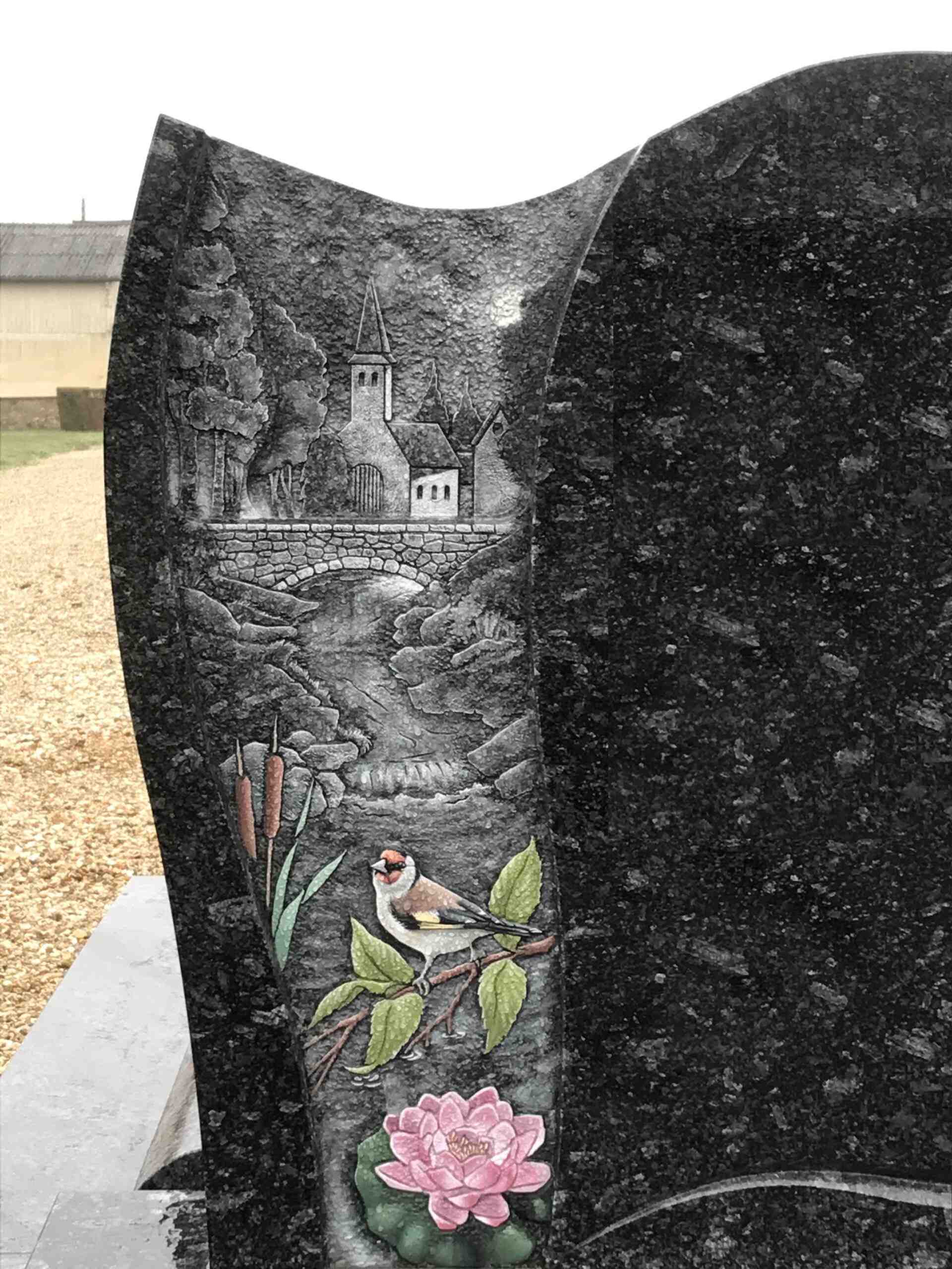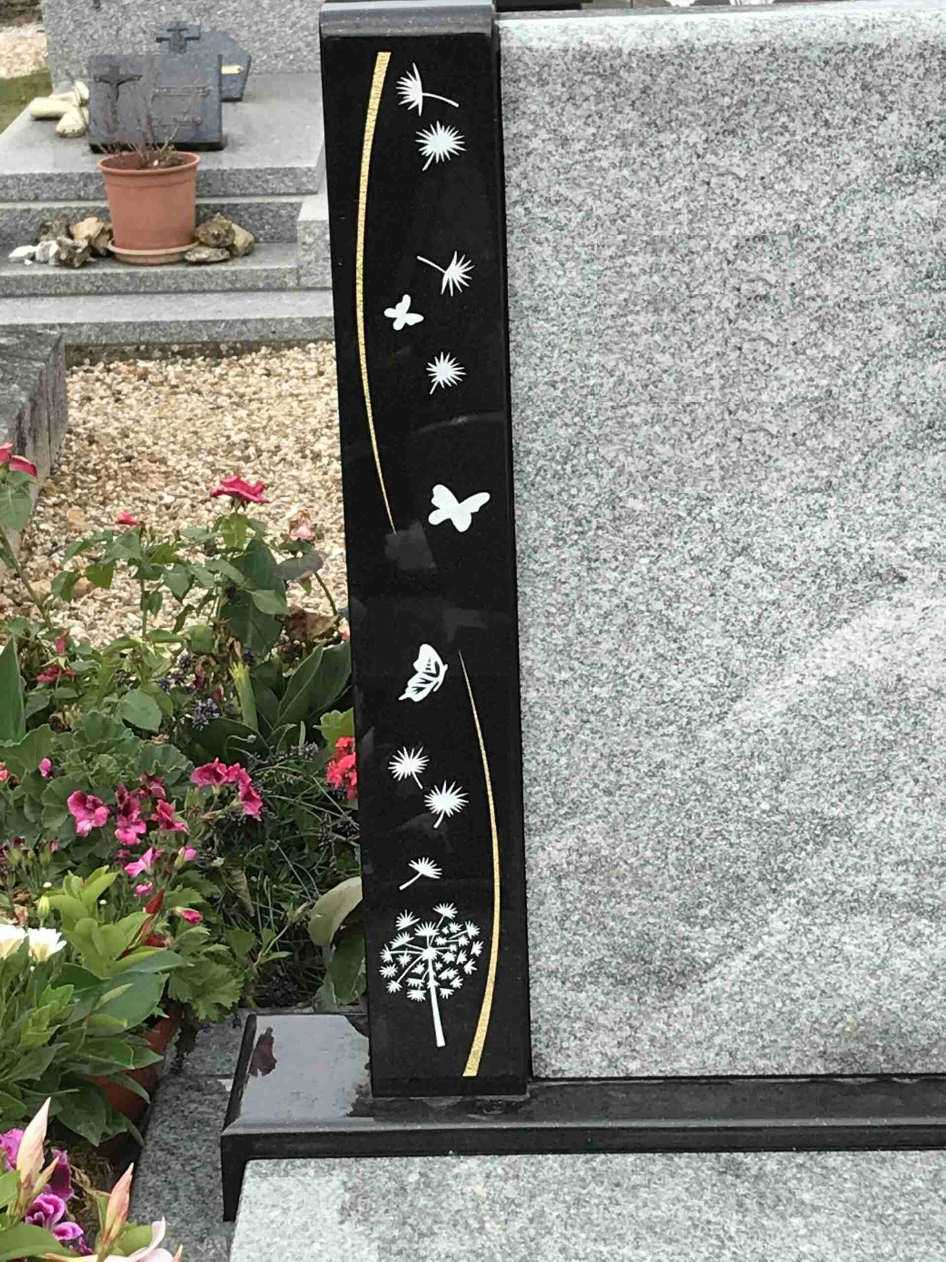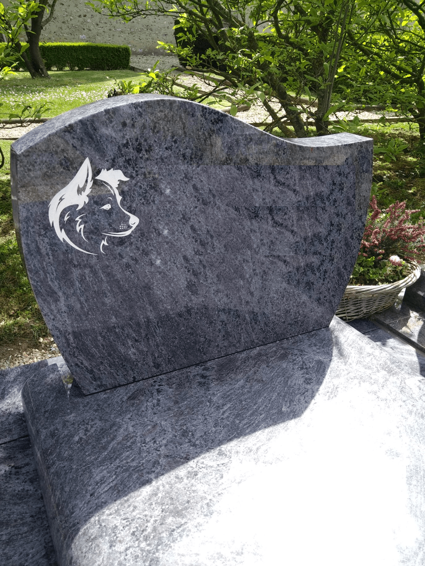 Monument funéraire Original en granit Lanhélin granit Breton avec motif litho gravé disponible avec ou sans motif, motif personnalisable,en plusieurs épaisseurs et plusieurs couleurs.