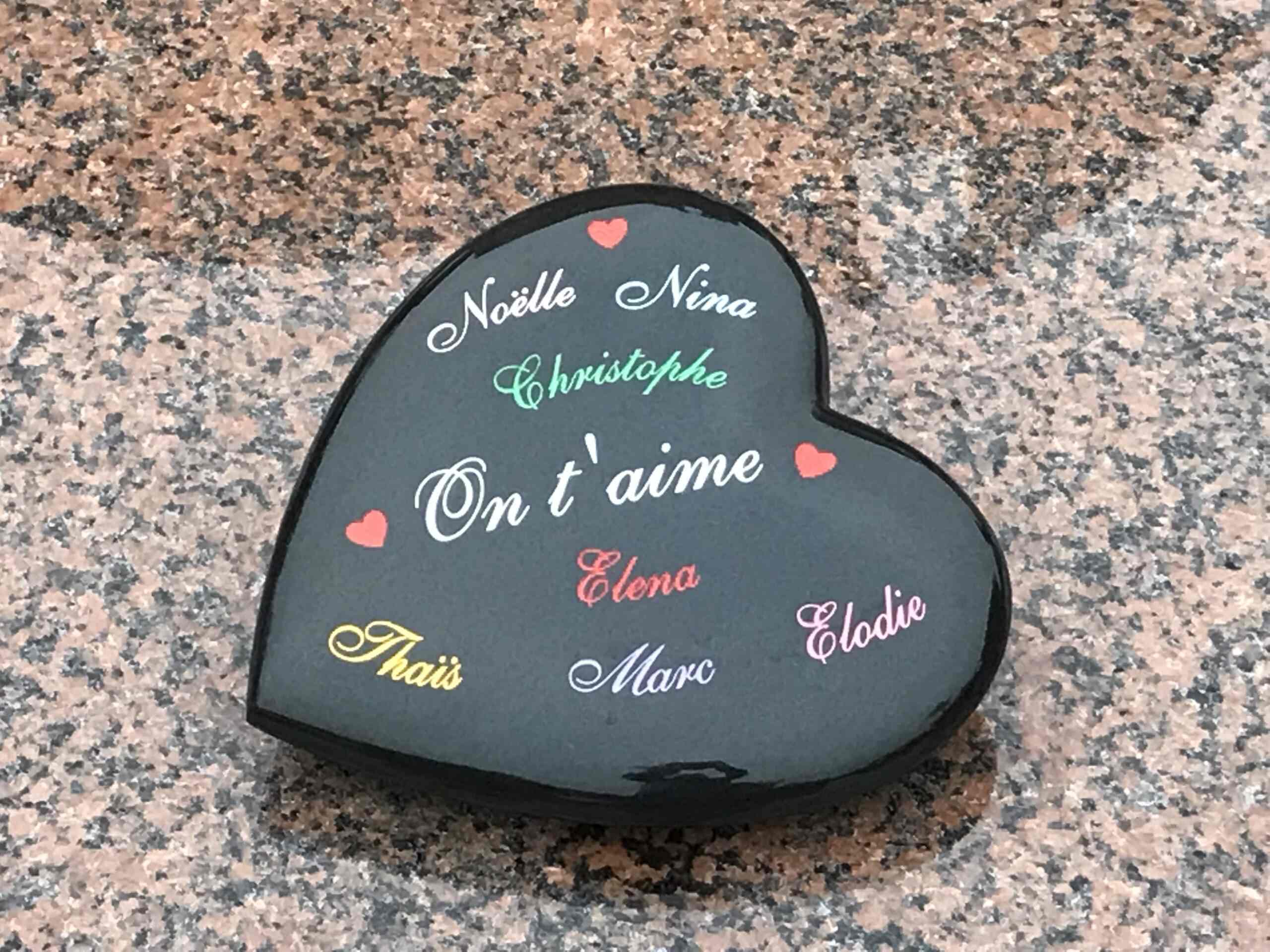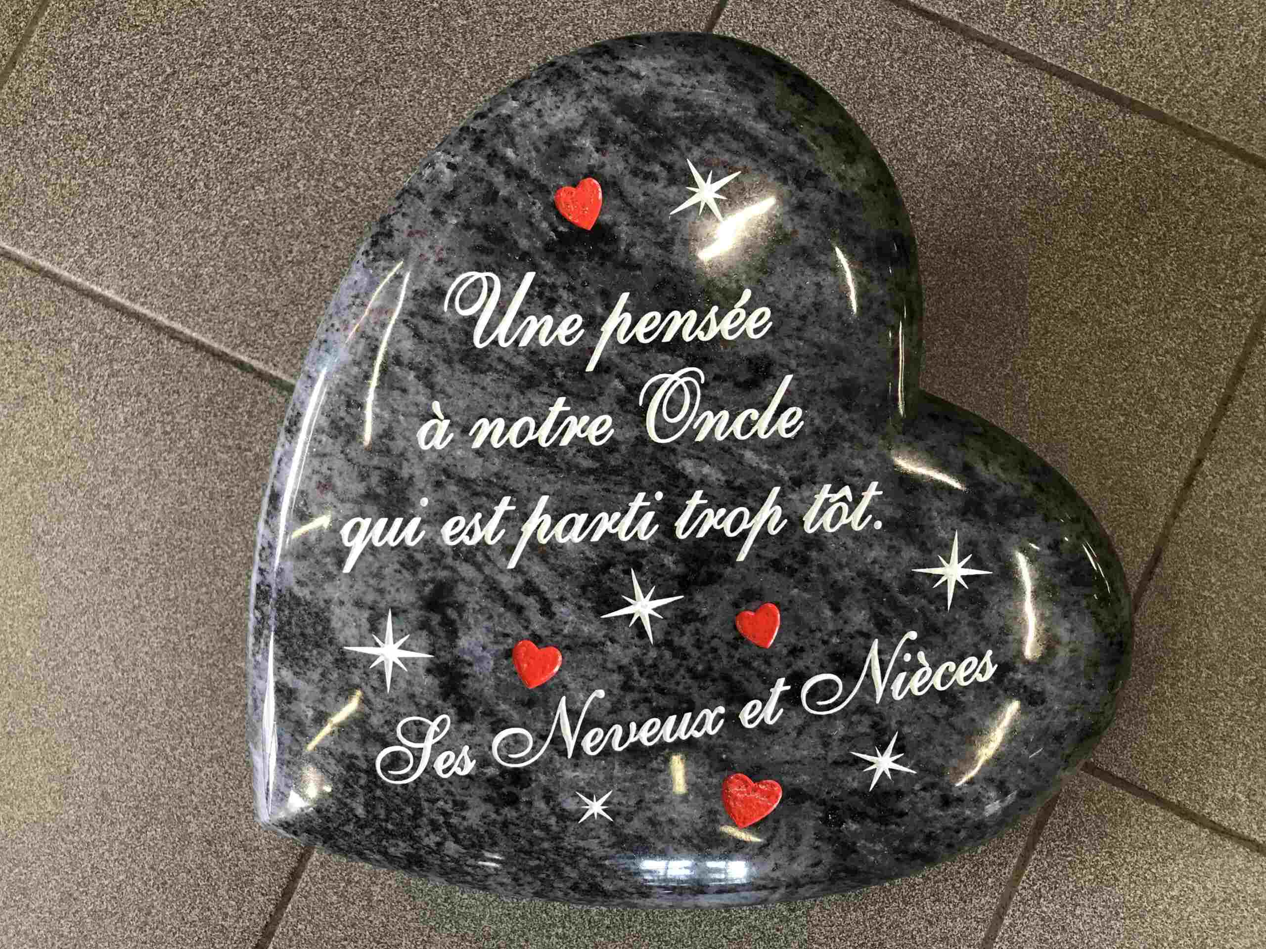 Monument funéraire Original en granit Romantica et Noir Fin disponible stèle forme double coeur, en plusieurs épaisseurs et plusieurs couleurs.