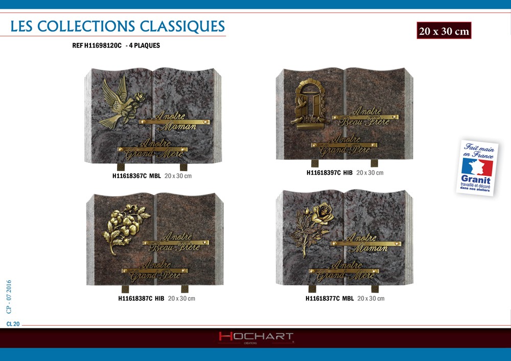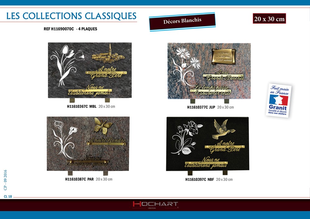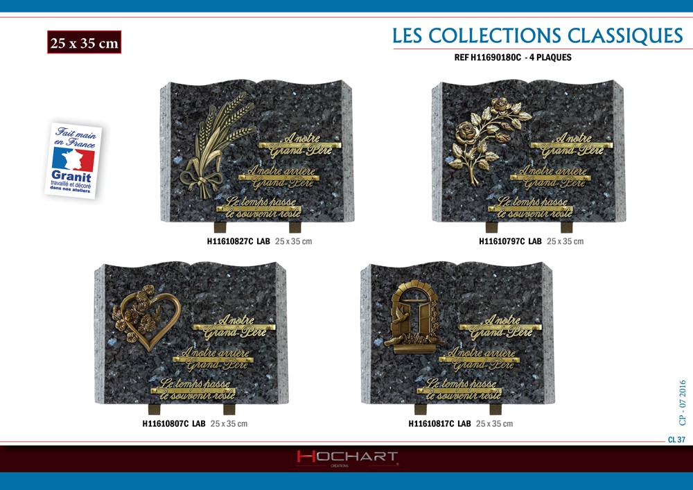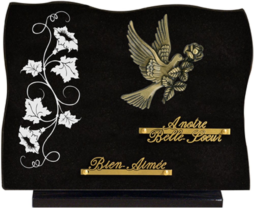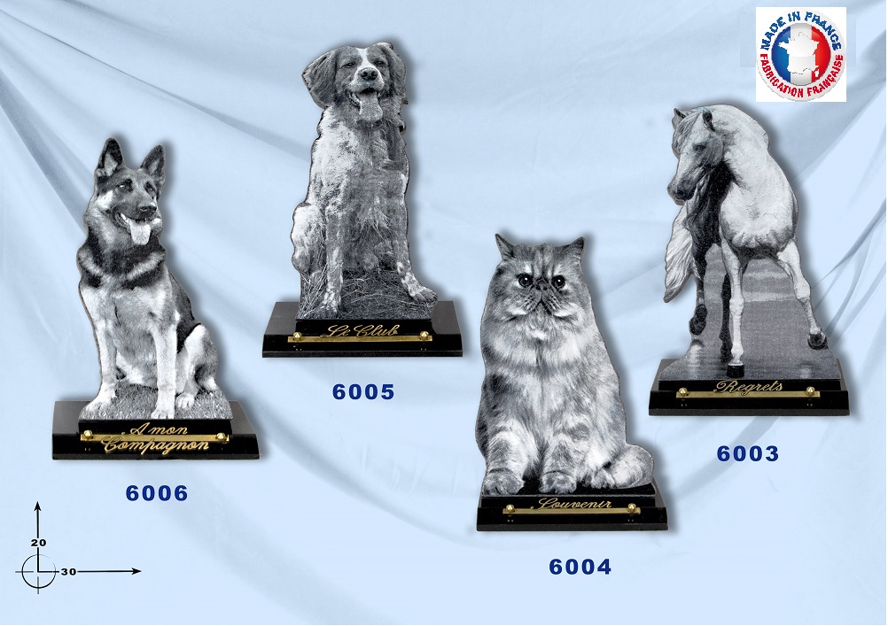 Nous disposons d’un large choix de plaques funéraires, des plus classiques au plus originales. Nous essayons d’avoir un large choix de thèmes comme la chasse, la pêche, le cyclisme, la musique, l’amour, etc.. Mais malgré tous nos efforts si aucune plaque ne vous convient nous pouvons en faire une sur mesure avec toutes les personnalisations de votre choix.